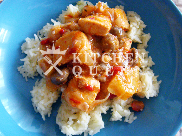Σε ένα αντικολλητικό τηγάνι ή γουόκ ζεσταίνουμε λίγο το 2 κ.σ. ελαιόλαδο και σωτάρουμε το κρεμμύδι το σκόρδο,τα μανιτάρια, το κοτόπουλο και τις πιπεριές. Διαλύουμε στο χυμό ανανά το κορν φλάουρ, την κέτσαπ, τη σάλτσα σόγιας, το μηλόξυδο και τη ζάχαρη. Τα προσθέτουμε όλα στο γουόκ και ανακατεύουμε σε δυνατή φωτιά για 1 λεπτό. Χαμηλώνουμε τη φωτιά και σκεπάζουμε για 20 λεπτά. Σε μια κατσαρόλα ρίχνουμε το νερό και μόλις βράσει αλατίζουμε και προσθέτουμε το ρύζι. Σερβίρουμε το κοτόπουλο με το ρύζι ζεστό.